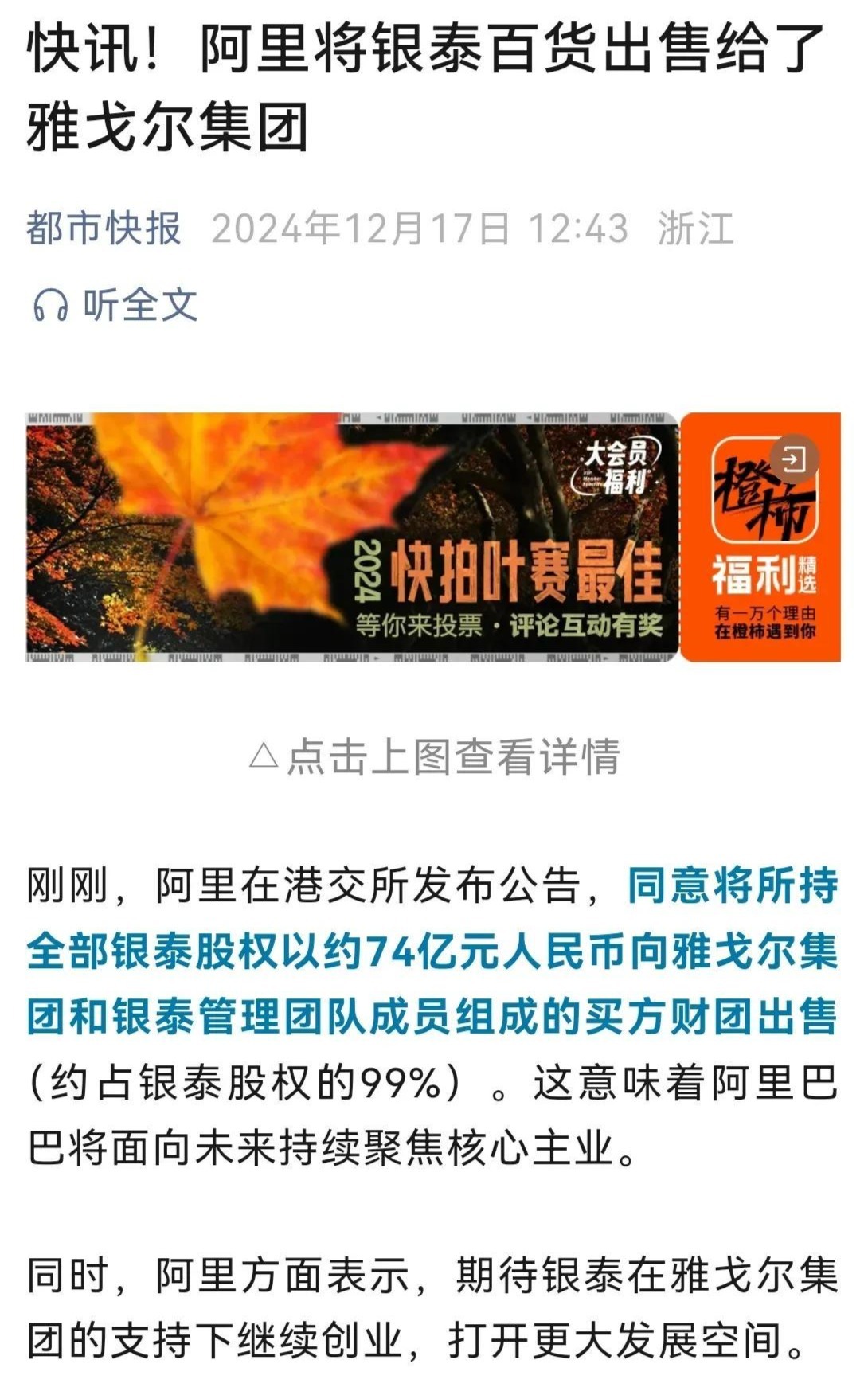 阿里巴巴今天成功以74亿元与雅戈尔服饰达成协议,以购买时花了180多亿相比,亏100亿出售给后者。
