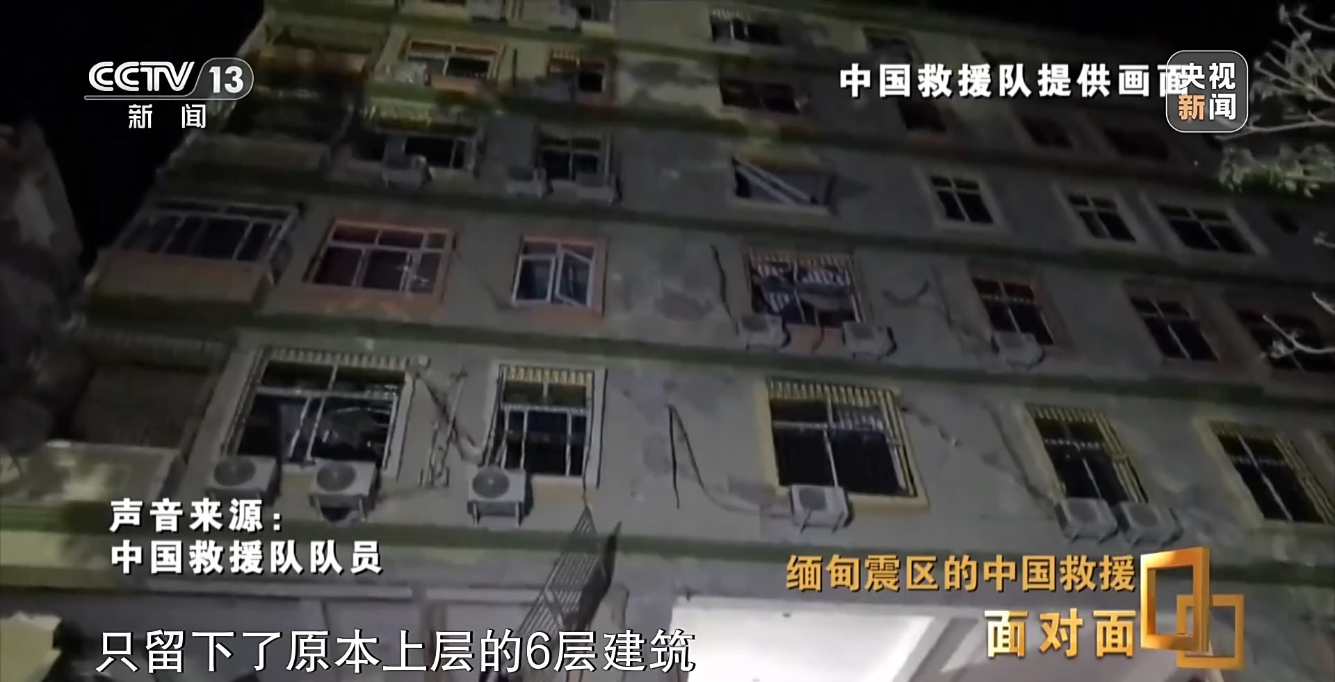 总台央视记者 张腾飞:现在是缅甸时间晚上的七点半,我们跟随中国救援队的先遣队来到了当地被称为长城饭店的地方,通过现场我们看到,受这次强震的影响,这栋酒店有一半的面积都出现了严重倾斜,而且特别是底层,出现了粉碎性坍塌。