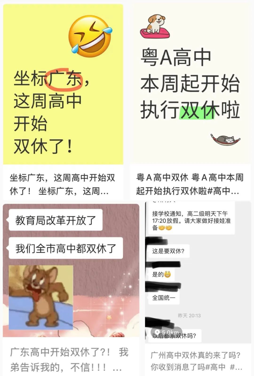 在社交平台上,不少网友发帖表示,广东清远、惠州、茂名、江门等地的高中将实行双休。此外,江苏省苏州市、浙江省杭州市等地也已在逐步推进落实普通高中双休制度,在湖南省长沙市,湖南师范大学附属中学等高中表示将严格执行教育局规定实行双休,开放教室、图书馆等场馆供学生自愿到校自习。