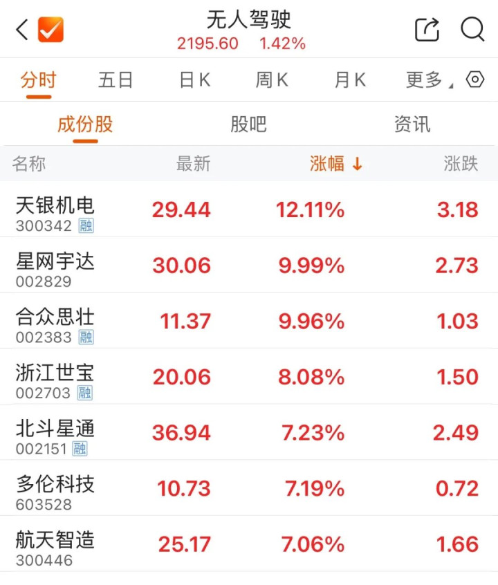 早盘,智能驾驶概念持续活跃,浙江世宝盘中一度走出7天5板行情。截至午间收盘,天银机电涨超10%,星网宇达、合众思壮涨停。